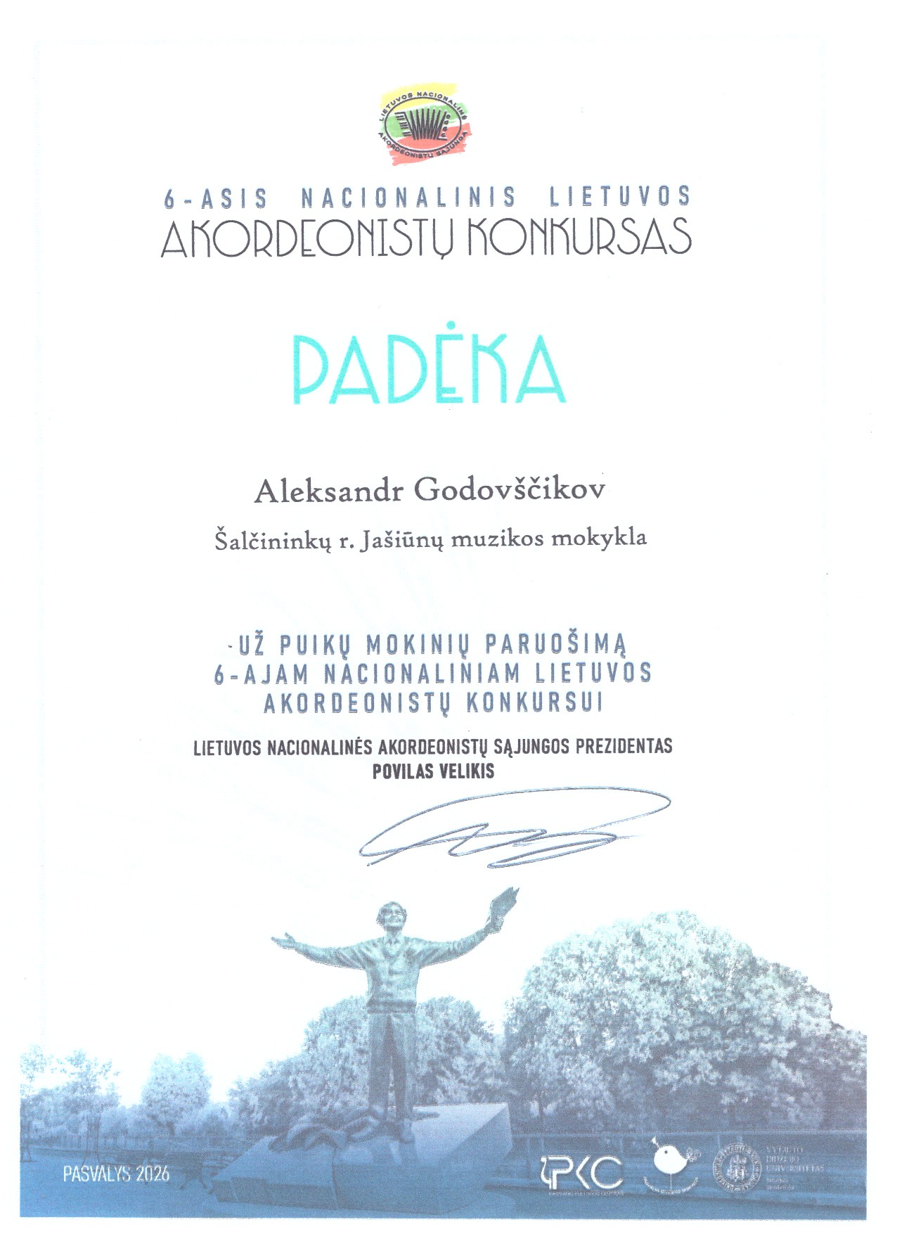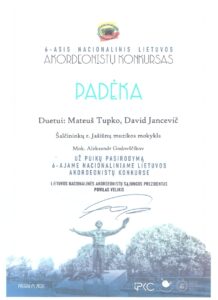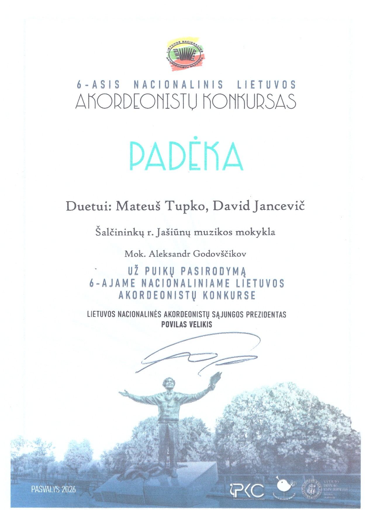 Konkurse taip pat dalyvavo Jašiūnų muzikos mokyklos akordeonistų duetas Mateuš Tupko ir David Jancevič, kuris ansamblinio muzikavimo kategorijoje pademonstravo muzikalumą, susiklausymą ir sceninį pasirengimą. Komisijos sprendimu duetas įvertintas diplomantų vardu.