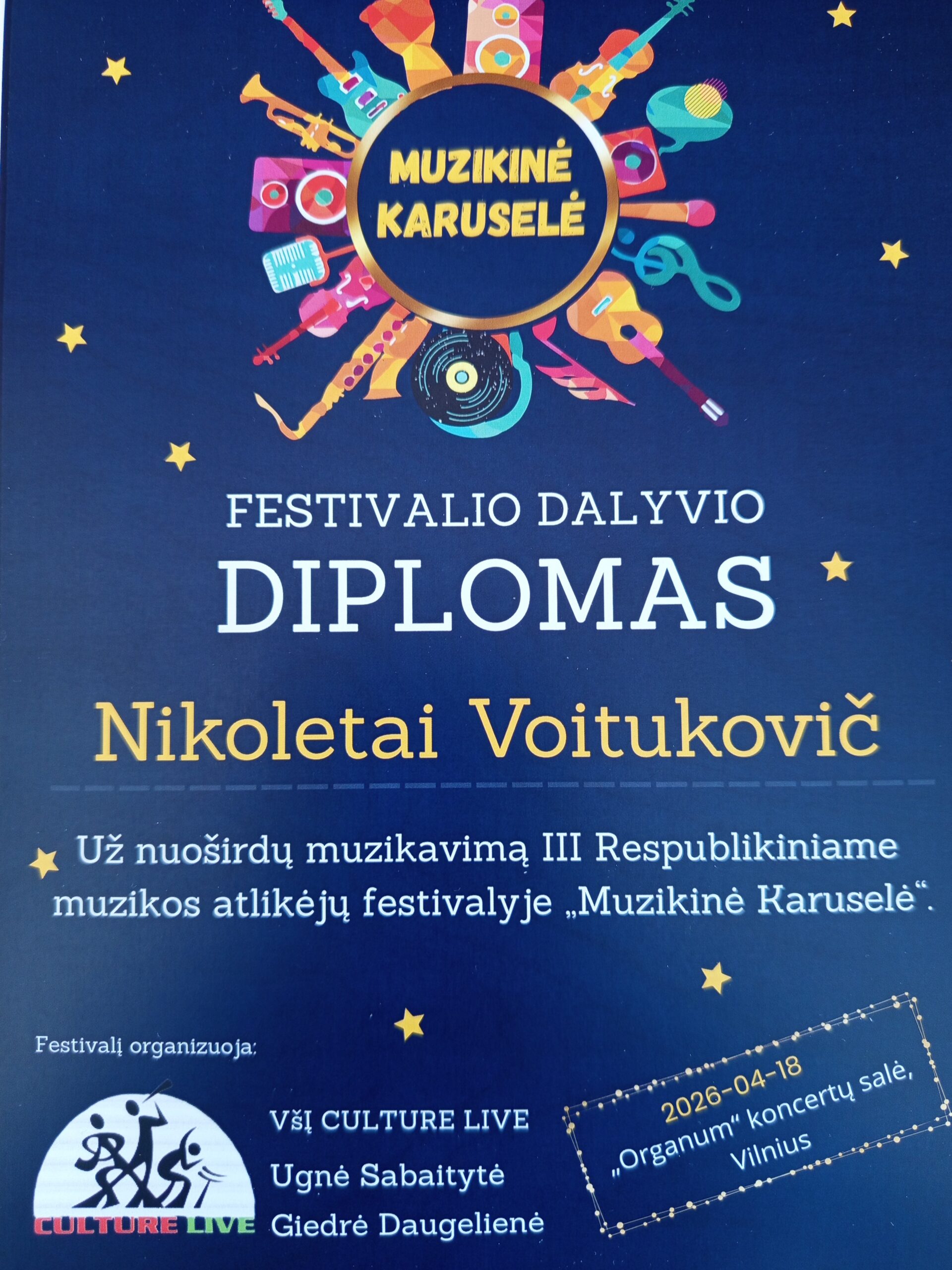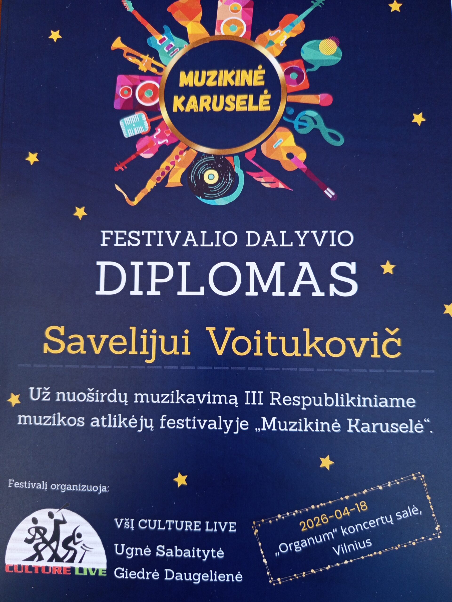 2026 m. balandžio 18 d. VšĮ „Culture Live“ organizuotame III-ajame muzikos atlikėjų festivalyje „Muzikinė karuselė“, vykusiame jaukioje ir puikia akustika garsėjančioje koncertų salėje „Organum“, dalyvavo Jašiūnų muzikos mokyklos mokytojos Natalijos Afanasjevos fortepijoninis ansamblis Savelij Voitukovič ir Nikoleta Voitukovič.